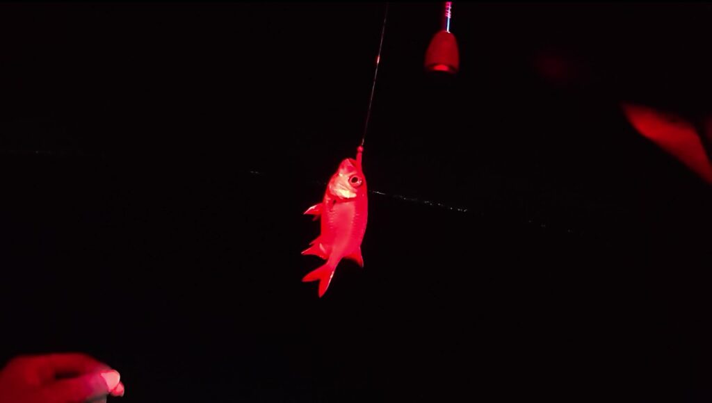 すると、船長にはアタリが続き、本命のアジこそ釣れないもののハタンポやネンブツダイをコンスタントに釣り上げていく…が、私の方にはほとんどアタリがないのか、それとも単にアタリがとれていないだけなのかもしれないがちっとも釣れない。