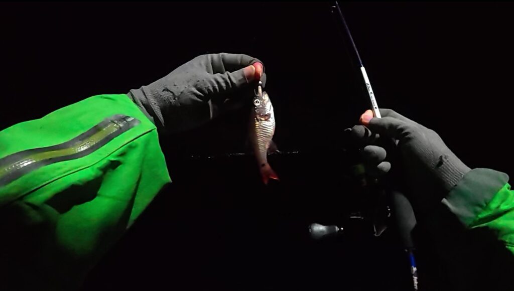 寒いので諦めようかと思ったが、何か釣りたいのでアジング用のジグヘッドリグで探ってみると…