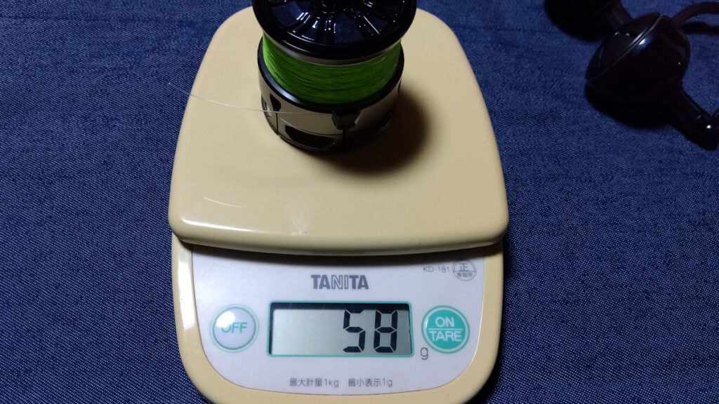 デュライズのスプール重量はPEライン込みで58g。